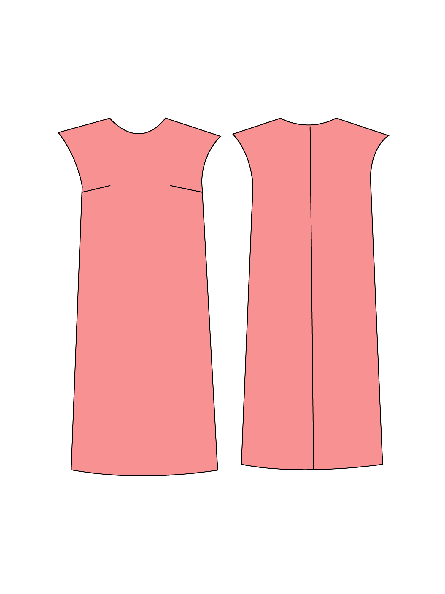 Printable layered pattern for simple dress in semi-fit silhouette in sizes XS, S, M, L, XL or plus sizes 1XL, 2XL, 3XL, 4XL, 5XL to make from light to medium weight woven or knit material with no or low stretch percentage, for example linen, cotton, satin, silk, sequins, lace, velvet etc.