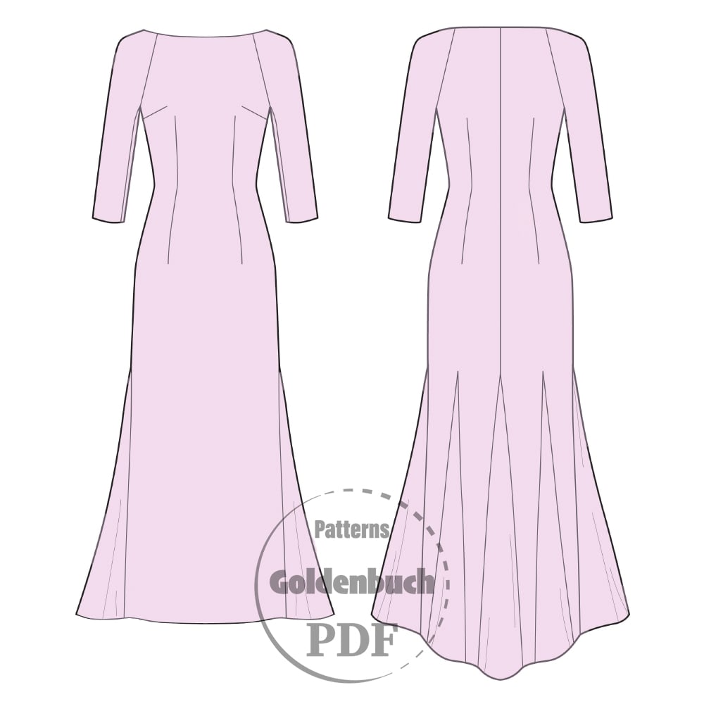Printable layered pattern for sheath prom gown with godet inserts in side and back seams in women sizes XS, S, M, L, XL or plus sizes 1XL, 2XL, 3XL, 4XL, 5XL to make from light to medium weight woven or knit material with no or low stretch percentage, for example satin, silk, chiffon, sequins, lace etc.