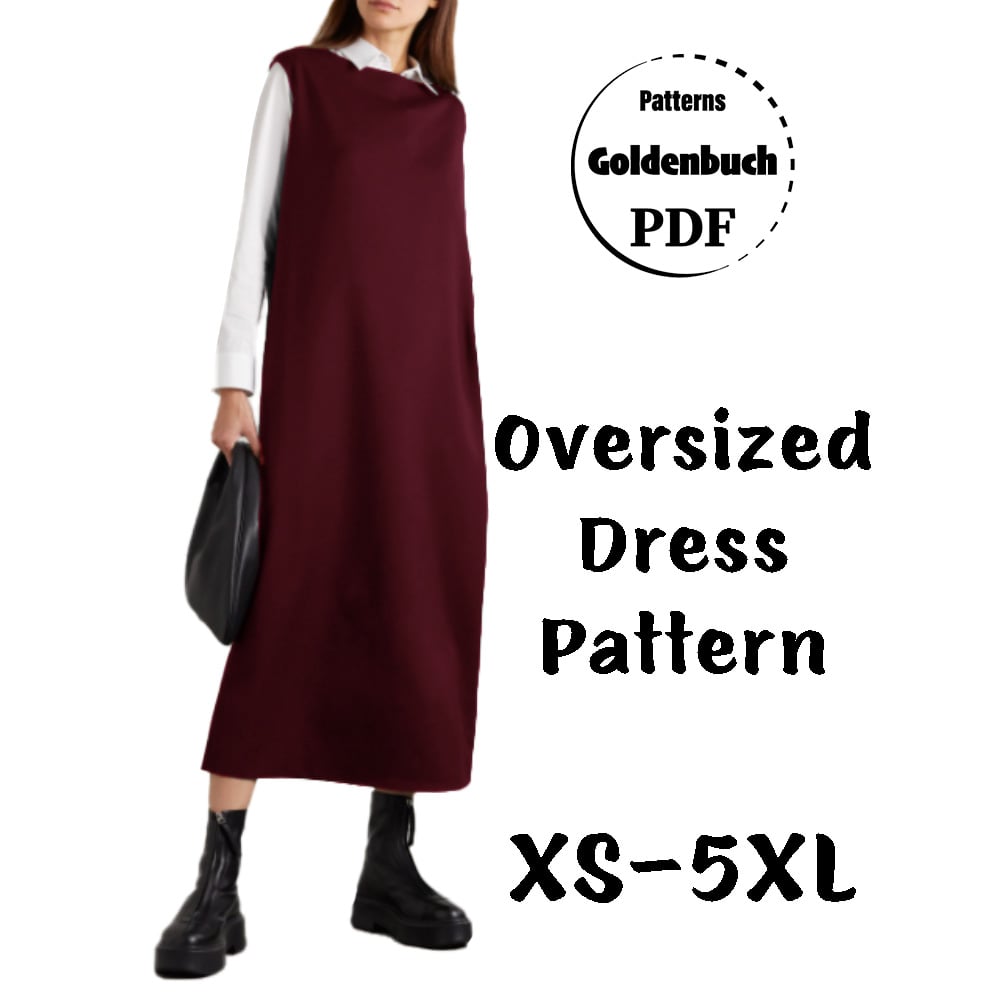 Digital download PDF sewing pattern for oversized women dress with drop shoulders. Simple tunic in midi length for everyday wear.