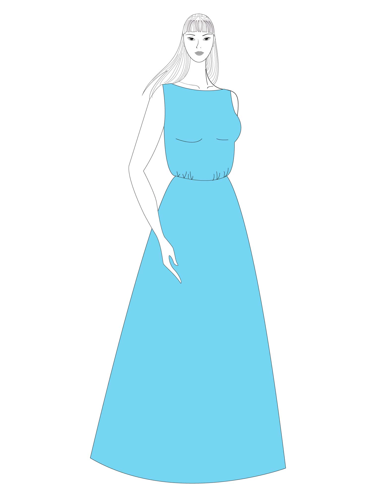 Digital download PDF sewing pattern for A-line maxi dress loose fit bodice and flared skirt.