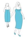 Printable layered pattern for bias cut midi dress in women sizes XS, S, M, L, XL or plus sizes 1XL, 2XL, 3XL, 4XL, 5XL to make from light to medium weight woven or knit material with no or low stretch percentage, for example linen, cotton, satin, silk, sequins, lace, velvet etc.