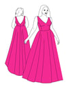 Printable layered pattern for A-line prom gown with bodice with princess seams and flowy skirt in women sizes XS, S, M, L, XL or plus sizes 1XL, 2XL, 3XL, 4XL, 5XL to make from light to medium weight woven or knit material with no or low stretch percentage, for example satin, silk, chiffon, sequins, lace etc.