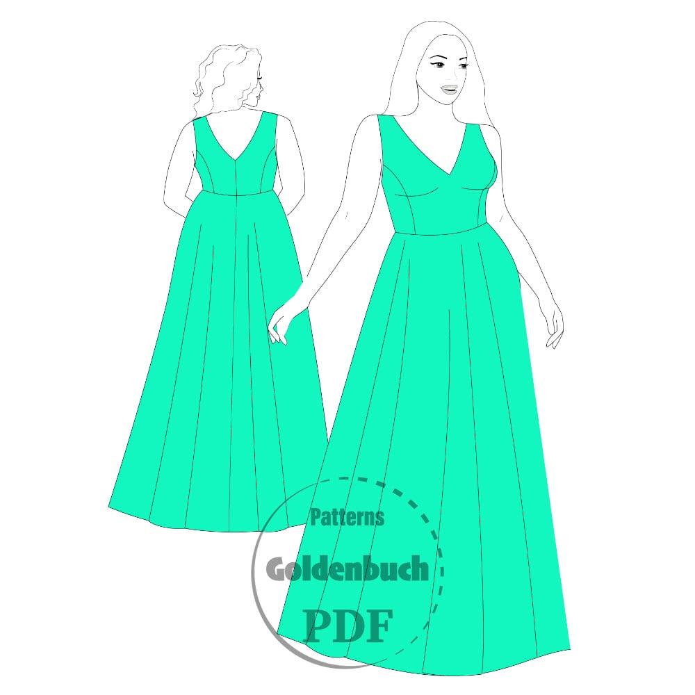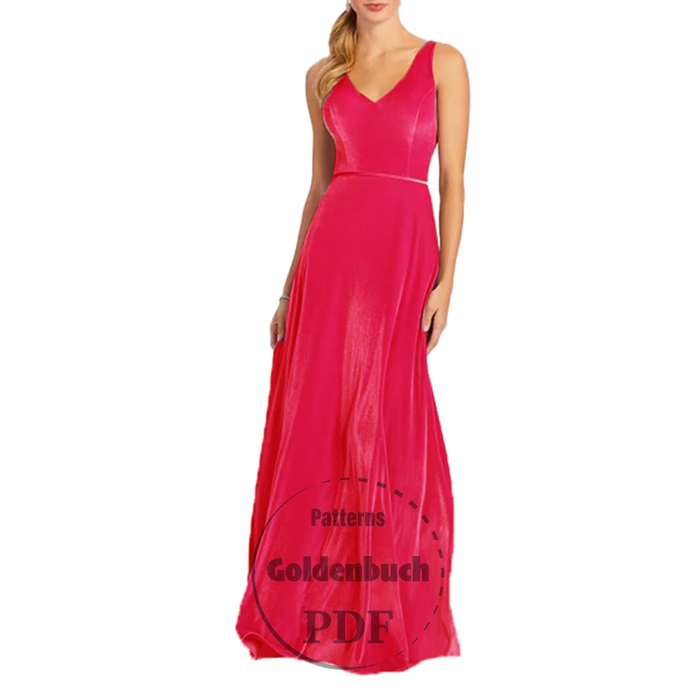 Digital download PDF sewing pattern for A-line maxi dress with plunging neckline and V-back. Perfect for wedding, bridesmaids, prom or formal event. You can add satin or beaded sash for nice waist accent.