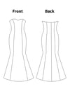 Printable layered pattern for floor length fishtail gown in women sizes XS, S, M, L, XL or plus sizes 1XL, 2XL, 3XL, 4XL, 5XL to make from light to medium weight woven or knit material with no or low stretch percentage, for example satin, silk, chiffon, sequins, lace etc.