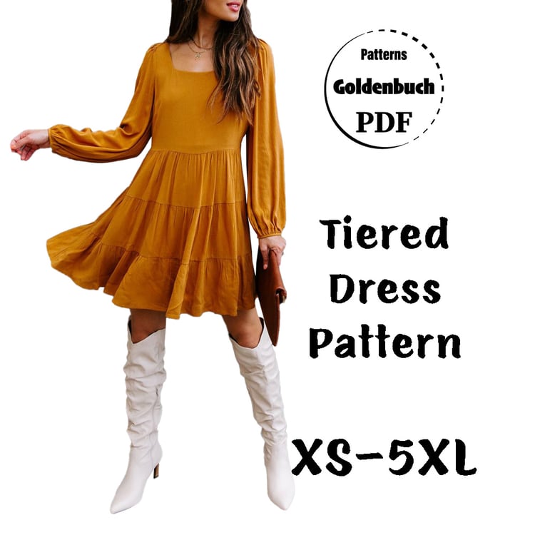 Printable layered pattern for A-line women dress with fitted bodice and flared skirt in sizes XS, S, M, L, XL or plus sizes 1XL, 2XL, 3XL, 4XL, 5XL to make from light to medium weight woven or knit material with no or low stretch percentage, for example satin, brocade, linen, cotton, lace, sequins etc.