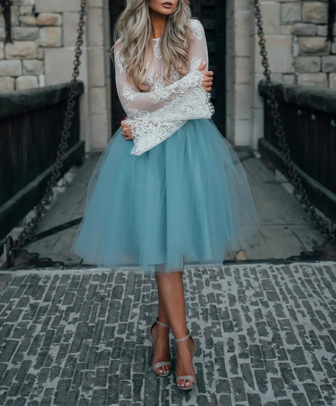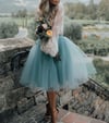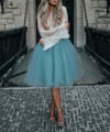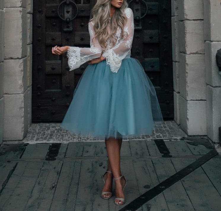 Printable layered pattern for adult tutu skirt in knee length and simple shirt with bell sleeves in women sizes XS, S, M, L, XL or plus sizes 1XL, 2XL, 3XL, 4XL, 5XL to make from light to medium weight woven or knit material with no or low stretch percentage, for example satin, silk, tulle, chiffon, lace, etc.