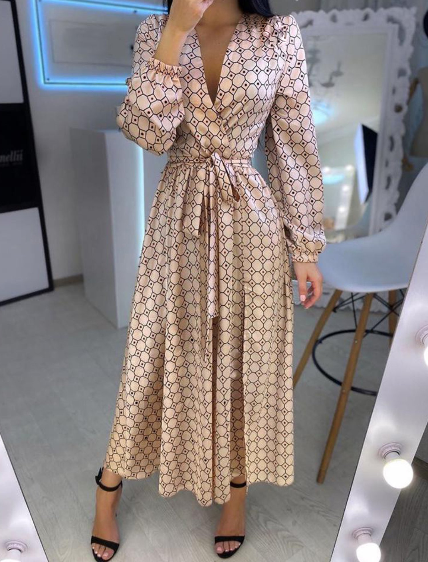 Digital download PDF sewing pattern for women wrap dress with long puff sleeves and V-neckline.