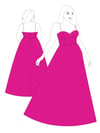 Printable layered pattern for A-line prom dress with fitted bodice and flared skirt in women sizes XS, S, M, L, XL or plus sizes 1XL, 2XL, 3XL, 4XL, 5XL to make from light to medium weight woven or knit material with no or low stretch percentage, for example satin, silk, chiffon, sequins, lace etc.