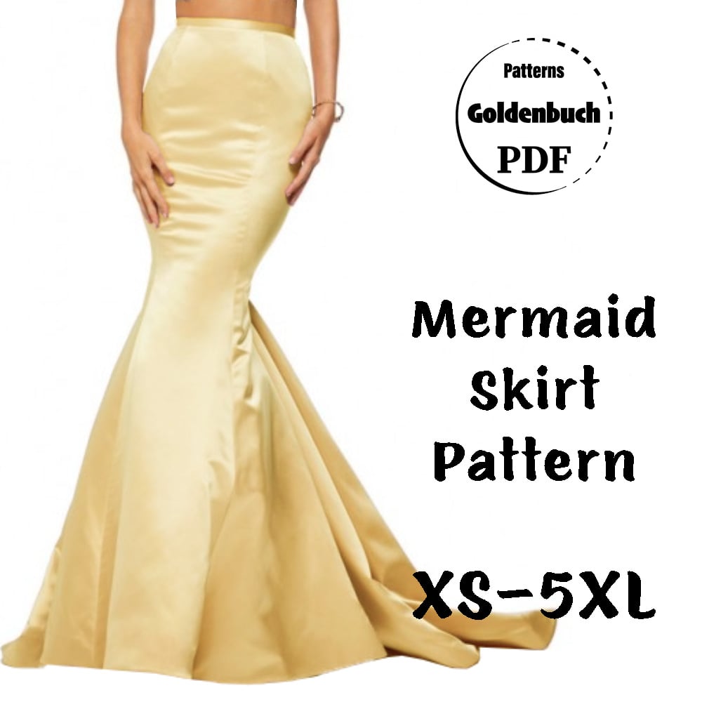Digital download PDF sewing pattern for mermaid women skirt in maxi length with train. Fishtail floor length skirt for wedding, prom or evening outfits.