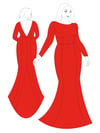 Printable layered pattern for fishtail evening gown in women sizes XS, S, M, L, XL or plus sizes 1XL, 2XL, 3XL, 4XL, 5XL to make from light to medium weight woven or knit material with no or low stretch percentage, for example satin, silk, chiffon, sequins, lace etc.
