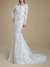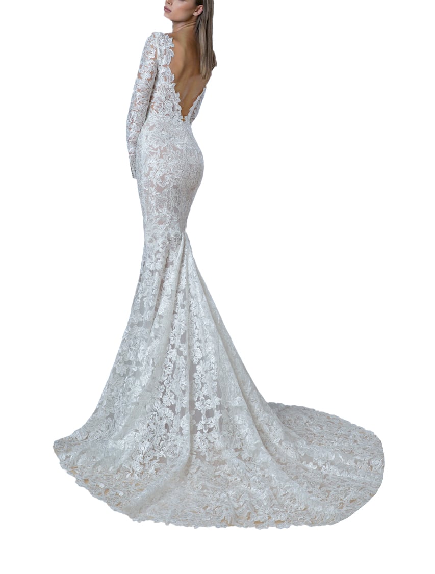 Digital download PDF sewing pattern for wedding dress in mermaid silhouette with train. Long sleeve bridal gown with low V-back.